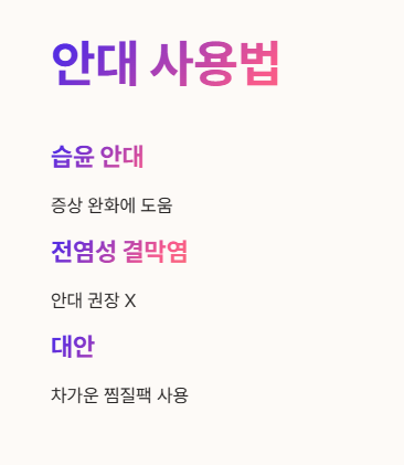 - 하지만 전염성 결막염에서는 권장 X (습한 환경이 세균 번식에 유리)