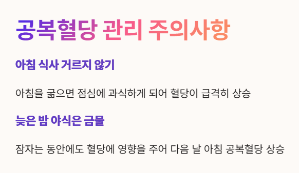 - 특히 저녁에 과식하거나 야식을 먹었다면 다음 날 아침 공복혈당이 평소보다 높게 나올 수 있습니다.