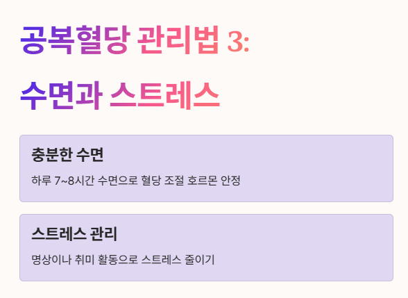 - 스트레스를 받거나 잠을 제대로 못 자면 혈당을 높이는 호르몬이 분비되어 공복혈당에 영향을 줄 수 있어요.
