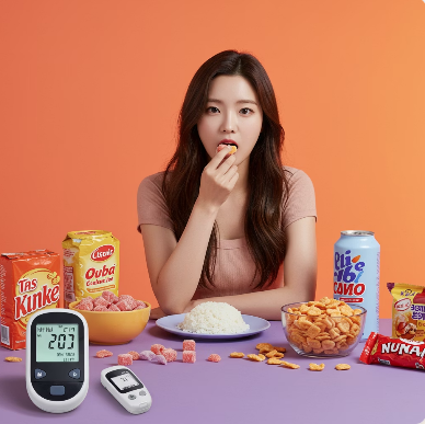 - 흰쌀밥, 빵, 면처럼 정제된 탄수화물이나 설탕이 든 음료를 자주 섭취하면 혈당이 급격히 오르기 쉬워요.