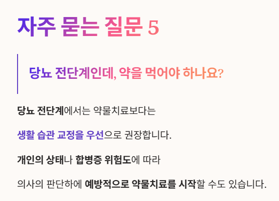 - A: 당뇨 전단계에서는 약물치료보다는 생활 습관 교정을 우선으로 권장해요.
