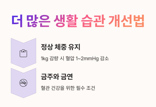 - 비만은 고혈압의 가장 큰 위험 요인이므로, 적절한 식단과 운동으로 정상 체중을 유지해주세요.